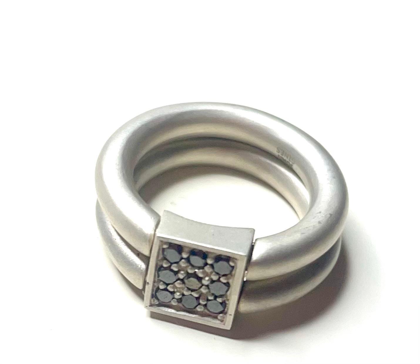 Anillo con forma de abrazadera y piezas con movimiento con incrustaciones de diamante negro.