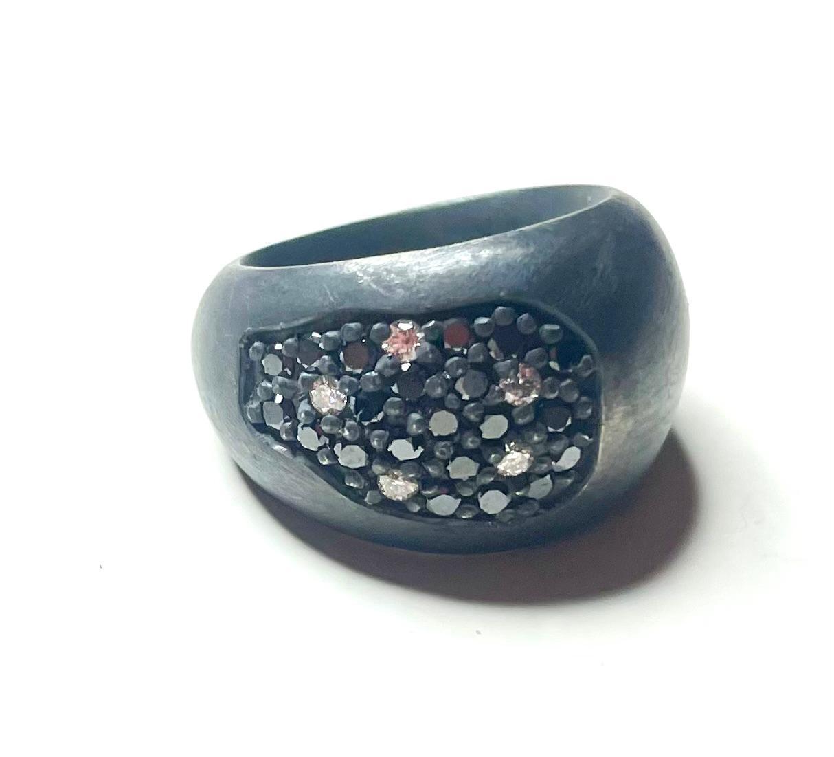 Anillo de Plata oxidada con incrustaciones de diamantes negros y blancos.